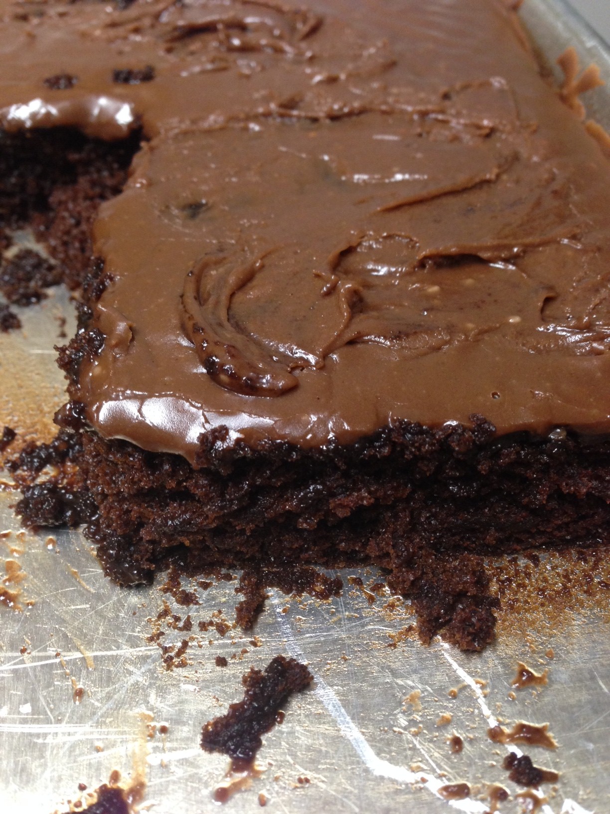 Use your favorite chocolate cake recipe, baked in a jellyroll size baking pan…approximately 10×13. Seriously, it’s the frosting that makes this cake devine. The one in the picture is a Martha Stewart basic chocolate cake recipe that I used.
