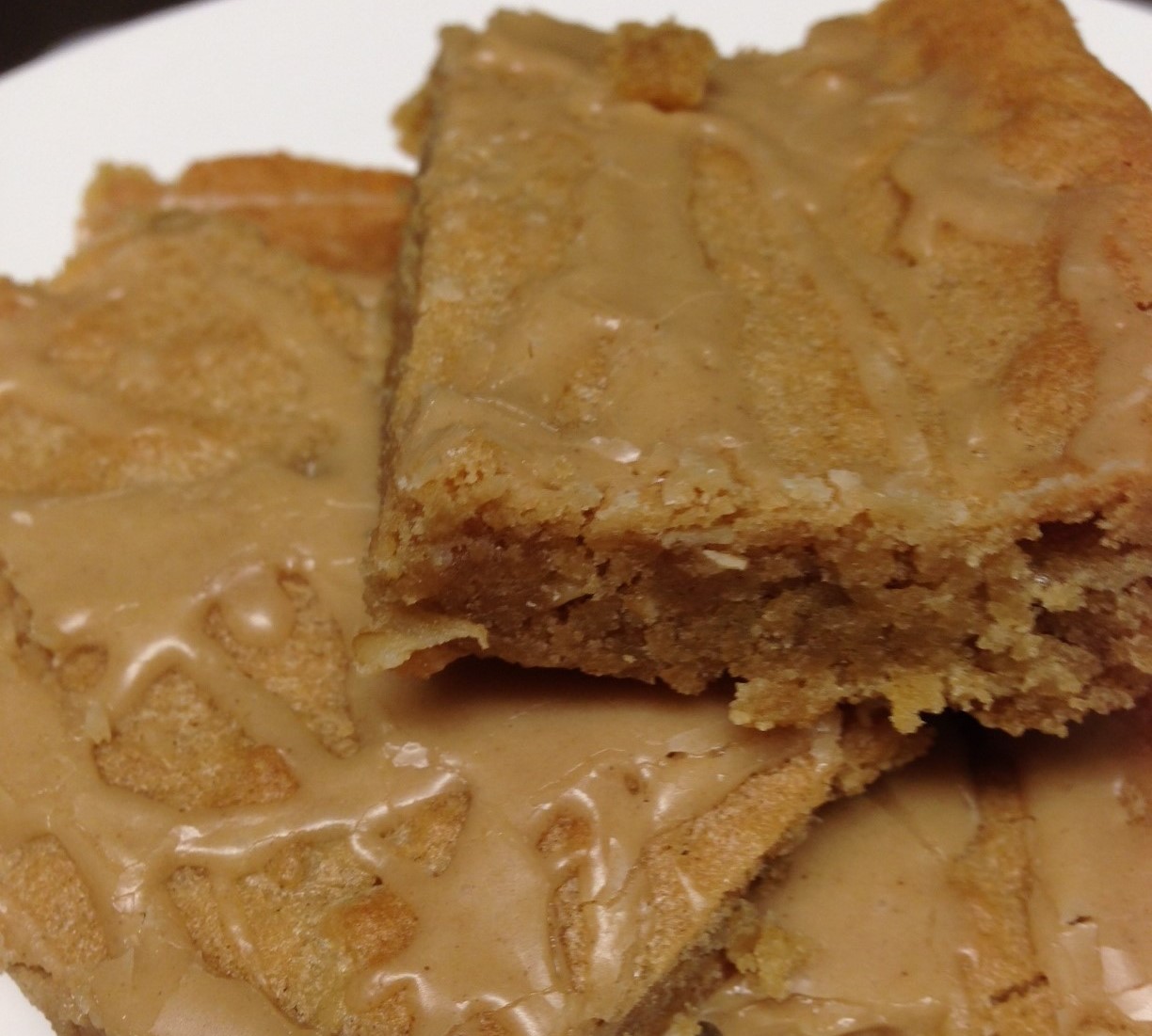 There isn’t a lot I like to remember from my school days. I really didn’t like school…had no interest in it, sadly. But I do remember my school friends and still think of them often. My friend Patrice, who I recently reconnected with…..YAY!!!!….was my good buddy in high school. We were the best of friends and got into some mischief together. We would stand in line at the school cafeteria for these delicious peanut butter chews. The chews were only made once or twice a week and they were fifty cents if I recall. You could smell them throughout the campus. I would sneak some quarters from my dad’s jar just to buy these chews. After I had graduated, I thought about those bars often. One day I was reading the newspaper, several years later. I saw that a reader had requested the recipe. Was I ever excited to see that the recipe was right there in the newspaper!!!!!!!!!!! The caption read “San Diego Unified School District gladly shares their recipe for a childhood favorite”. WOOHOO!!!!!!!!!!!!! I went home that night and made a batch and I have been making them ever since. They are amazing. So rich, chewy, sweet, buttery and oh so comforting. They are drizzled with a peanut butter glaze and melt in your mouth. YUM-M-M.
