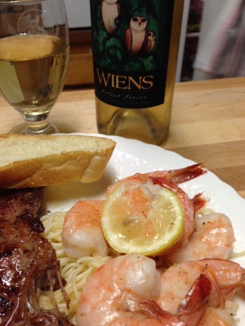 If you are a shrimp lover, this is the easiest and tastiest shrimp dish. The shrimp is tender, melt in your mouth, buttery, lemony and very shrimpish. You just throw everything in a baking sheet and bake.  I added a juicy steak and some angel hair pasta and had a nice surf and turf dinner. It really didn’t need the steak, but you know me….I gotta have my beef. It would be great to throw in some cherry tomatoes and garlic, but I didn’t. I made this just like the recipe I found on Pinterest. The possibilities are endless here as to what you can throw in. Get creative……get your shrimp on!!!!!!!!!!!! Oh and don’t forget to have a great glass of wine with it. My favorite is anything from Wiens Vineyard in Temecula. I think I mentioned that before! More on that in a future post.