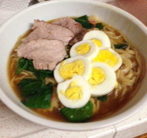 Place some noodles in a serving bowl. Ladle some broth on top. Place the meat slices, egg and veggies on top in a pretty manner. Sprinkle with green onion. Grab your chopsticks and slurp, slurp. As I said, you can add anything you like to this dish. Just make sure you have a great tasting broth! Enjoy