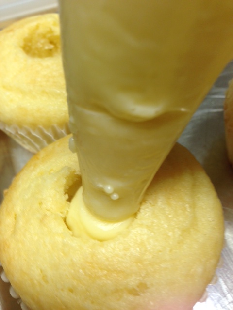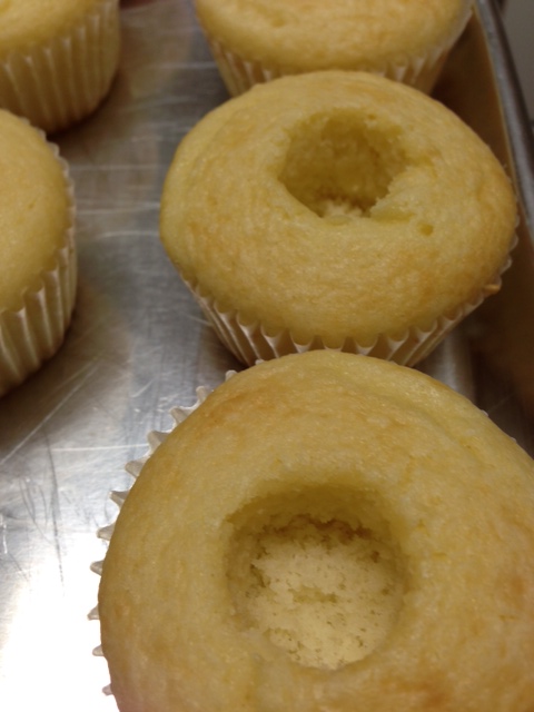 If you don’t have a little cupcake scooper thingy to make a hole in your cupcake, not to worry. Use a spoon, knife, or don’t make a hole at all. Just insert your piping bag tip right into the cupcake, and fill the cuppies that way. BUT DON”T SQUEEZE too much or you will have a cupcake explosion. Hope you will make these and enjoy!!