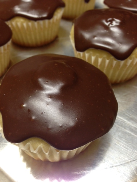 Cupcake Friday at the office is Cupcake Thursday this week. I am taking a much needed day off Friday to stretch out the long holiday weekend!! Woohoo! So, today’s cuppy is a vanilla cupcake, filled with a yummy pastry cream. Then they are topped with a decadent sticky chewy chocolate frosting that is one of my favorites. OMG, this stuff is just dangerous. It’s like the best……..like eating a slightly melty fudge candy….but better. You could just eat it by the spoonfuls. But don’t do that! You will get a headache…. and probably go into a sugar coma. After all, it is pretty darned sweet. It will turn into a bad experience and you will never make this frosting again. So, just use it sparingly.