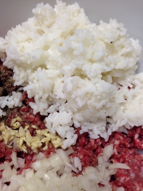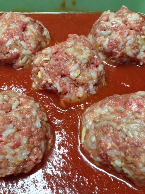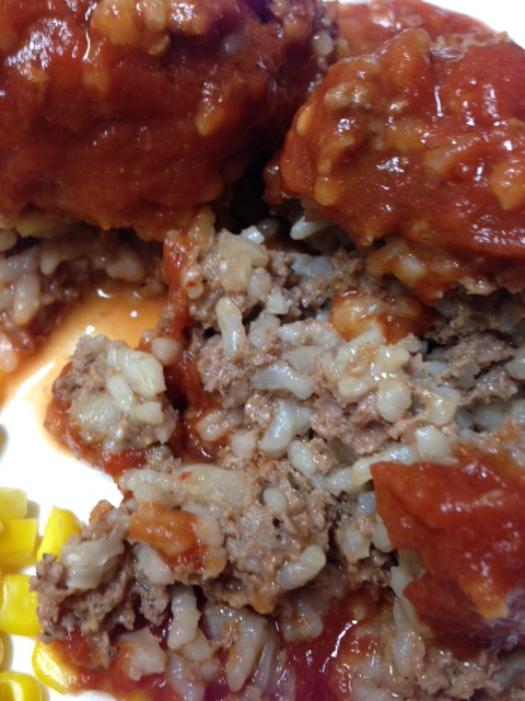 Mix the ground beef or turkey, the onion, the 2 tblsp of tomato sauce and the rice together. Form into 4 good sized balls. Place in a baking dish. Mix together the 2 cans of tomato sauce, salt and pepper. Pour it over the balls and bake at 350 for about 45 minutes-1 hour. Serve with a scoop of the sauce over the meatballs. Great with corn, green beans, a salad…whatever you want! Is that easy or what!!