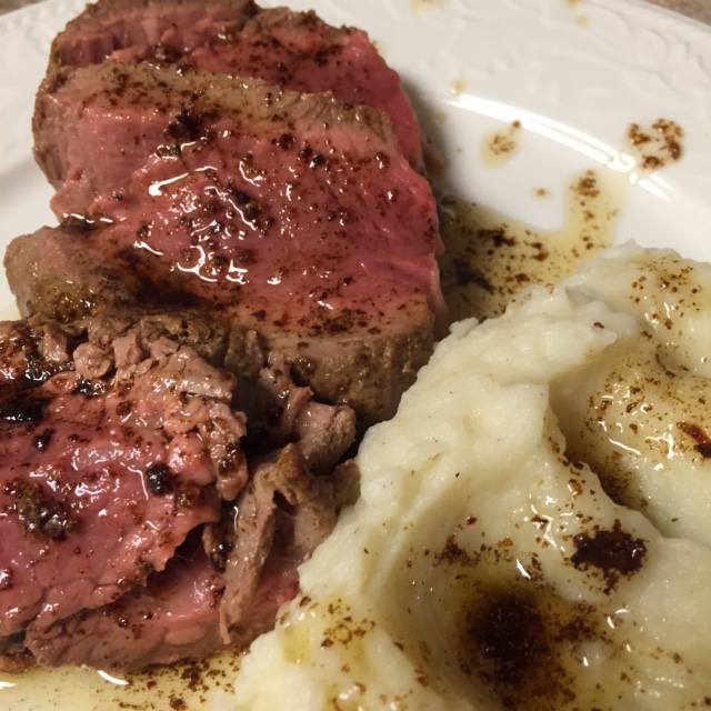 Looking for an idea for a special dinner? How about a Chateaubriand….otherwise known as a …beef tenderloin/filet mignon roast. It is delicious, tender….melt in your mouth. It’s basically cooked in a pool of butter. I mean, how could it not be good, right??It may sound pretty fancy, right? But it’s actually pretty simple and quick. Impress your guests with a wonderful dinner of this luscious beef, served with buttery mashed potatoes and a green vegetable. You will be so pleased!!
