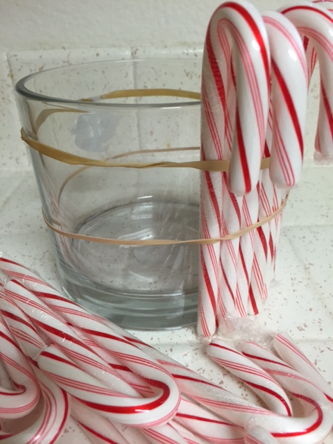 Put 2 rubberbands around your vase, and start putting your candy canes under the rubberbands, against the vase.