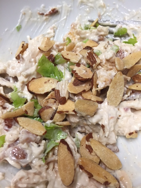 One of my favorite sandwiches is a chicken salad. I was in the mood for a chicken and bacon club sandwich, but at the last minute, I decided to make a chicken salad and I just crumbled up the bacon and just mixed it right in. It was delicious. It was a great combination. Using an applewood smoked bacon is best. You really want that bacon flavor to come through. This is my go to chicken salad recipe and it’s delicious. I add sliced crunchy almonds but you certainly don’t have to if you’re not a nut fan. I LOVE nuts…some of my good friends are nuts. Haha 🙂