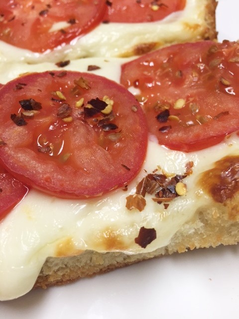 Heat oven to 400. Place your bread on a baking sheet lined with foil. Spread some garlic butter or sprinkle on some olive oil onto the bread. Or you can use pizza sauce. Start putting on the cheese. Add tomato slices (or whatever else you want). Drizzle with a wee bit of olive oil and place the pan in the oven. Bake just until the cheese gets melty and ooey gooey. At this point, I sprinkle on some crushed red pepper flakes. YUM. Take that first bite…get that crunch and chew and all that melty goodness. Mmmm-m-m-m–mmm