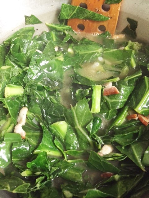 If you are using bacon, chop it up in bite size pieces and fry it in a large pot with the onion. Add everything else and cook for 2-3 hours on low to medium heat until tender and no longer bright green. If you are using ham hock or turkey leg, just throw it in with the greens, stock and water. This cooks up great in a crock pot too.