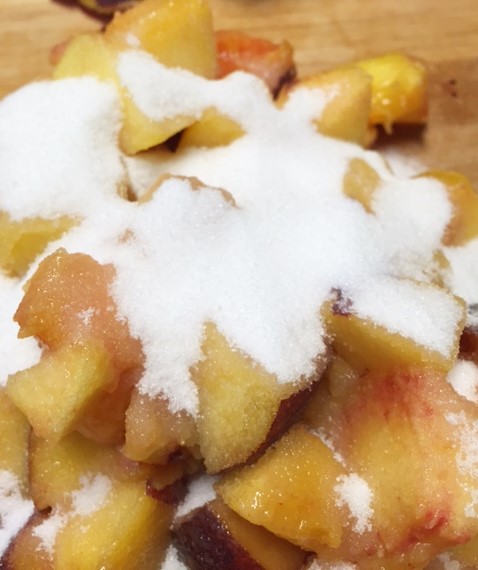 In a bowl, toss peaches and sugar together. Pour into a strainer and allow to sit like that for 20 minute. I save the juices for my ice tea.