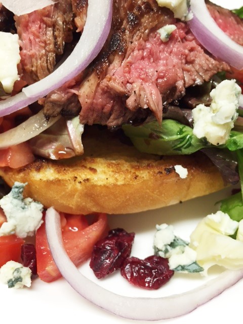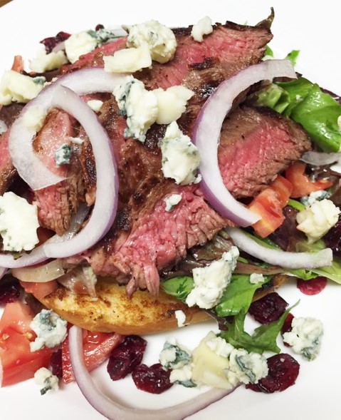 Mix everything but the steak together, in a large bowl. Toss with salad dressing and scoop it onto a plate. Arrange slices of steak on top. Sprinkle with a few blue cheese crumbles. Simple right?