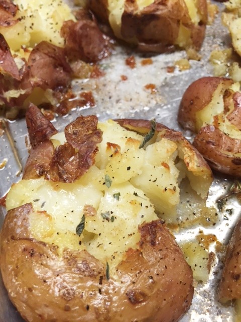 Heat oven to 450. In a large pot of water, boil the WHOLE, cleaned potatoes until fork tender, but not too soft. Drain potatoes. Lightly coat the bottom of a baking sheet with a bit of olive oil. Dump drained potatoes on the baking sheet. Place Potatoes about 3″ apart. Using your palm, or a potato masher, carefully smash down each potato, until they burst open. Using a pastry brush, dab each potato with the olive oil/butter mixture. Sprinkle with seasonings and herbs and bake for 15-20 minutes, until browned and crisp. Serve immediately.