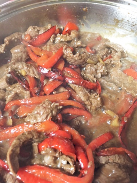 This is one of my long time favorite dishes ever. I love red bell peppers. However, bell peppers in general, do not like me. Ohhh, the agony of heartburn….indigestion. But I have been craving this so bad. So, I took some anti heartburn stuff and thoroughly enjoyed this wonderful dish. I did make it a bit spicy, but if you follow my blog, by now, you know how much I love my spicy. Whenever I make this, I use a nice ribeye steak, but this time I used sirloin. Because I marinated it a bit beforehand, it was really very tender. If you are not a meat eater, you can just use tofu or just the peppers.  Make some steaming hot rice and ohhhhhhh you will love this.