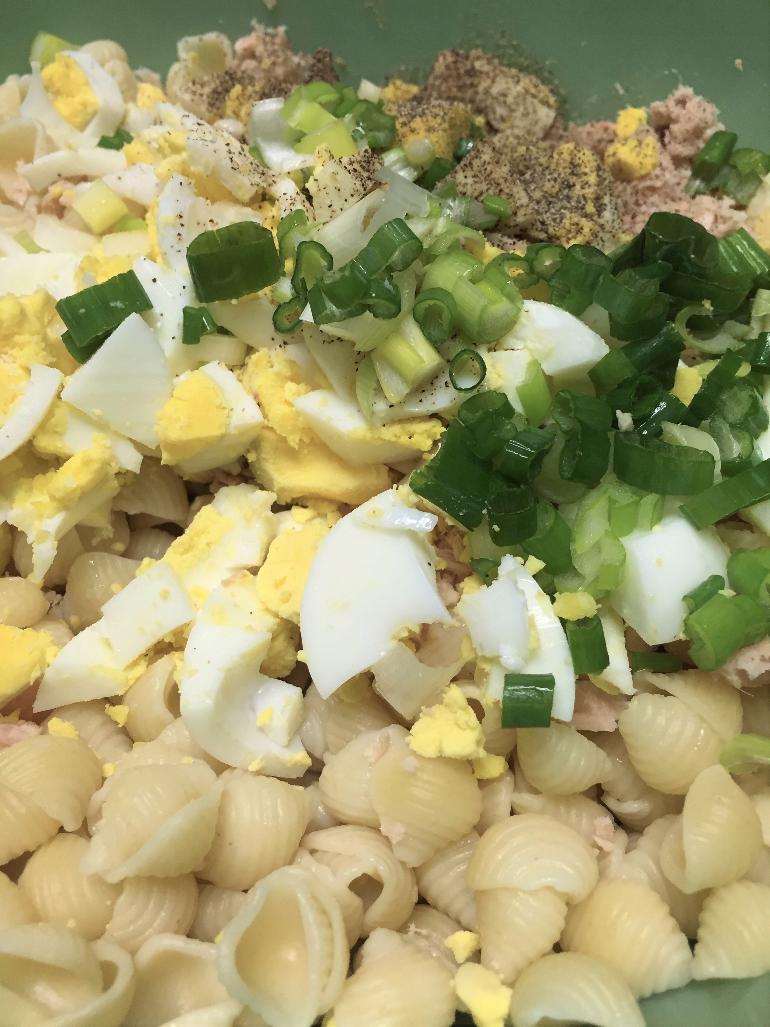In a large bowl, mix together the sour cream, mayonnaise and green onions. Add in the eggs and tuna. Add the pasta and gently stir it together. Add more mayo if you need to. Cover and refrigerate until nice and cold. You may have to add more mayo once chilled.