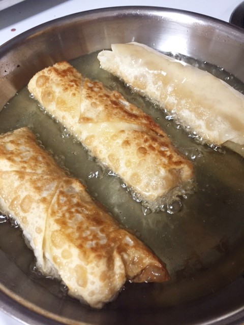 Pour approximately 1 inch of vegetable or corn oil, into a heavy skillet. Turn heat to medium/medium high. Fry and flip until both sides are nice and brown. Remember, the filling is cooked so, don’t over fry.