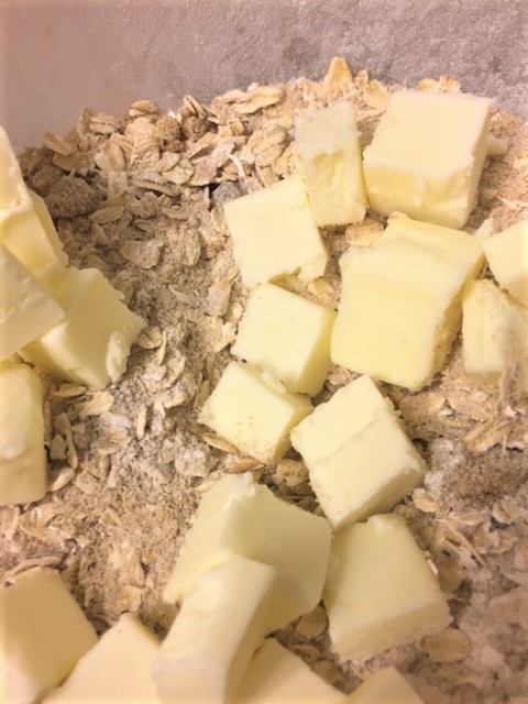 In a bowl, mix together the flour, oats, sugars and cinnamon. Add the butter cubes and with your fingers, smoosh the butter and dry ingredients together until it’s all crumbly. Sprinkle the topping all over the fruit mixture. Bake for about 20-25 minutes, until your fruit is bubbling hot.