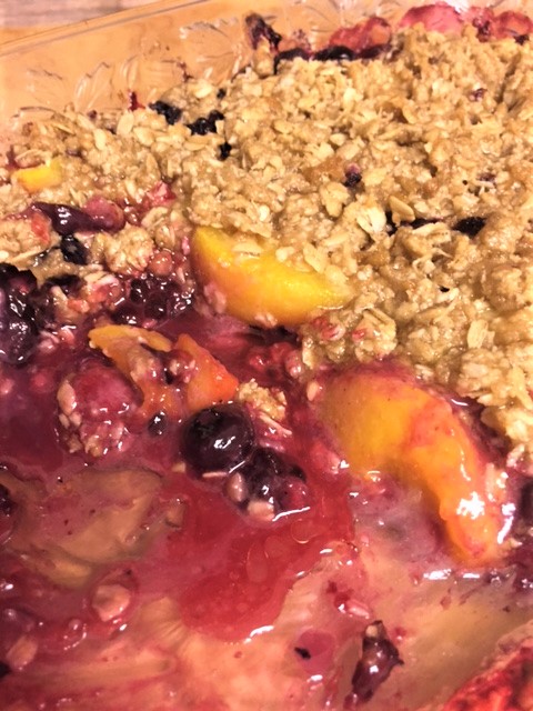 I love to make homemade ice cream with berries, or to eat them just plain……or slightly sugared on top of vanilla ice cream. Dammit, I love berries. This time, I decided to make a berry crumble. I had some frozen peaches on hand, so I threw those in there too. Peaches and berries go really well together. Did you know? If you make this, you’ll find out!