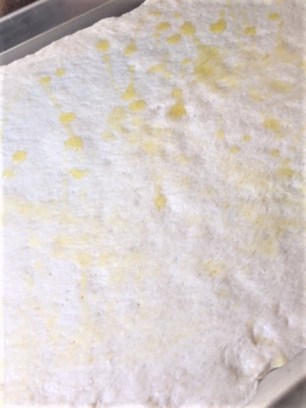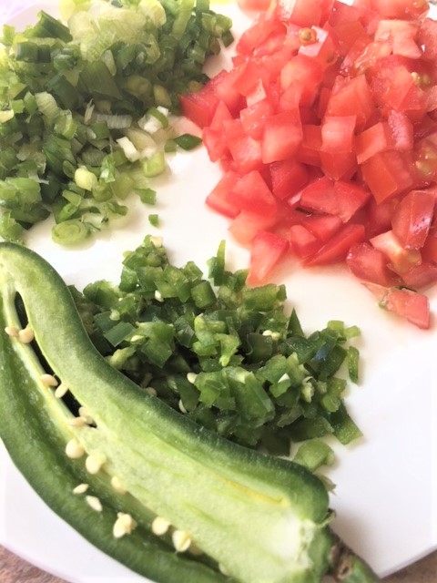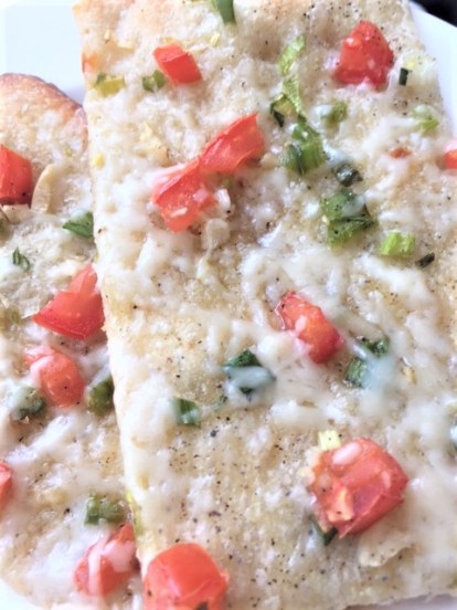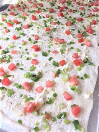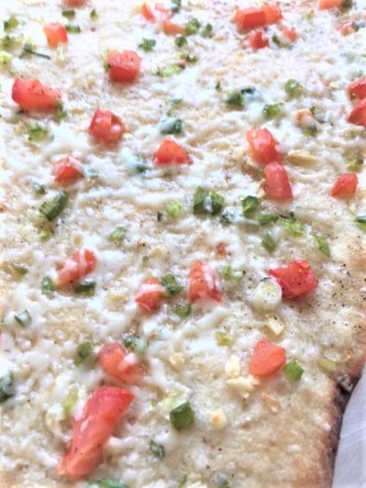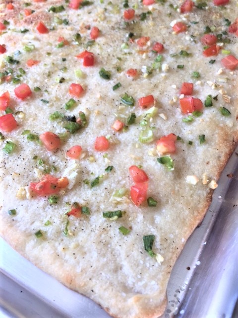 One of my most favorite restaurants ever, ever, was a place called Bruno’s. It’s no longer open, but I sure miss it. They had the best pizza, the best spaghetti in the world and the best chocolate cake you ever tasted. They would cut it up in little serve yourself squares. My friend Leslie and I would pile our plates with that cake and then complain later that we were overly stuffed. Everything they served there was good, but my favorite thing ever was this unusual pizza they made. They would always have four different kinds of pizza…all were good, but I only cared about this one pizza. It had no sauce and no cheese, so it wasn’t heavy. I’ve never seen any other restaurant serve it. It was a thin crust, brushed with olive oil. It had sprinkles of minced green onion, jalapeno and fresh tomato. Then it was sprinkled with some coarse salt and pepper. It was AMAZING. I started making it at home. A lot. It’s so easy and quick and cheap too! I sometimes make my own pizza dough, but I don’t know why. The store-bought pizza dough is great.