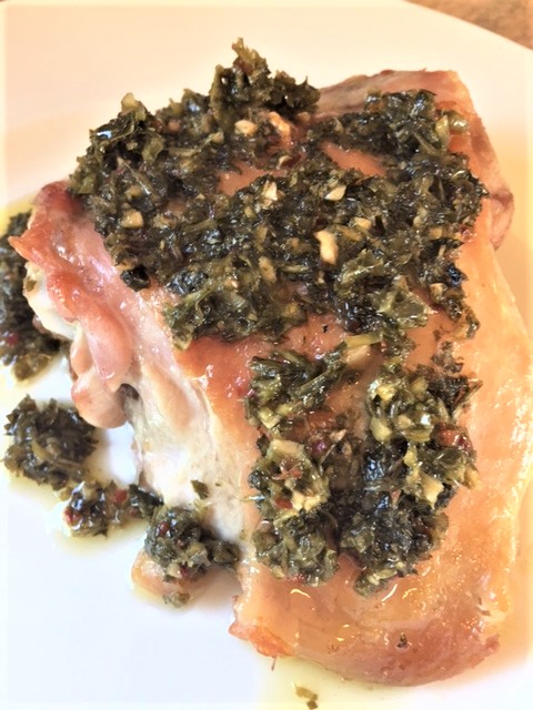 My favorite way to have it is on thinly sliced steak. You just drizzle some on the slices and it’s delicious. But it’s so delicious on chicken thighs. This is the easiest dish ever. It’s pretty much only two ingredients if you use a purchased chimichurri.