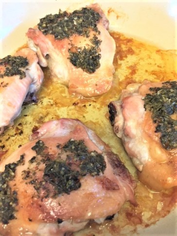 Salt and pepper your chicken thighs, both on the top and bottom. Place them on a baking sheet. Bake them for about 20 minutes. Spoon some chimichurri sauce on the thighs. Continue baking for another 25-35 minutes, or until the thighs are done. Mine take 45 minutes in my oven. Spoon a bit more sauce over the chicken when serving.