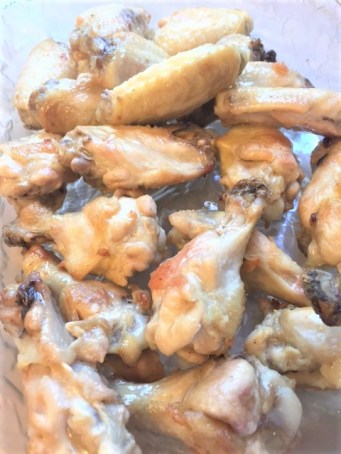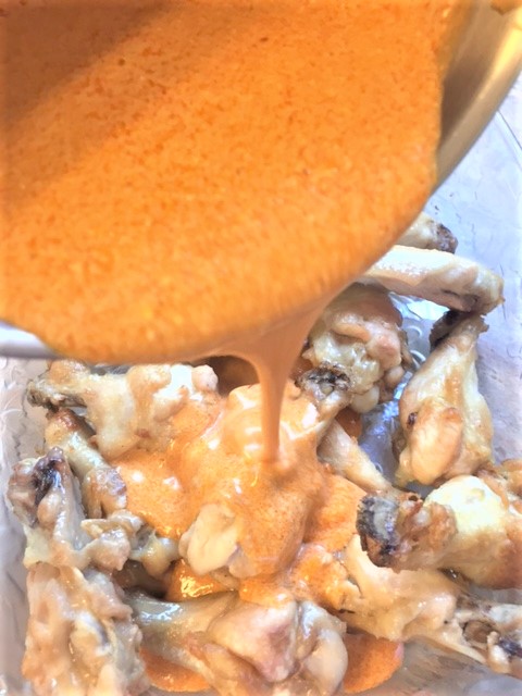 When wings are cooked, dump them into a bowl or deep dish and pour the sauce over them. Give them a toss to coat completely. Serve immediately.