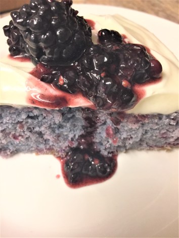 This is a single layer cake. It doesn’t rise much. It’s good. But I have to say, it was better the second day. It was much more blackberry-ish. It doesn’t have a real intense flavor, but it’s there. I do recommend frosting this cake lightly. Cream cheese frosting is pretty heavy and rich and you won’t want to take away from the flavor of the cake. The frosting is not the star of this show.