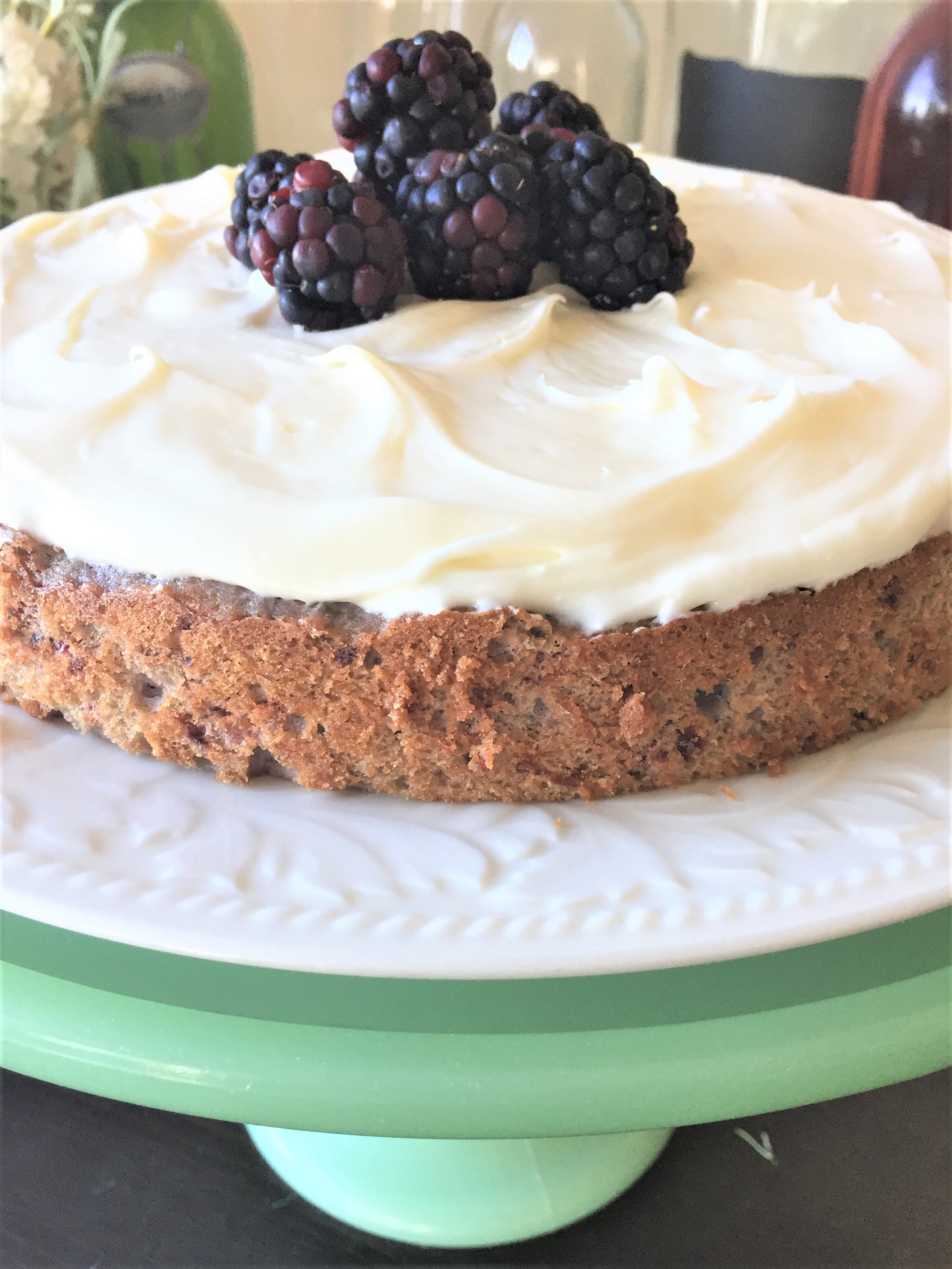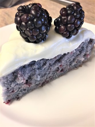 This is a single layer cake. It doesn’t rise much. It’s good. But I have to say, it was better the second day. It was much more blackberry-ish. It doesn’t have a real intense flavor, but it’s there. I do recommend frosting this cake lightly. Cream cheese frosting is pretty heavy and rich and you won’t want to take away from the flavor of the cake. The frosting is not the star of this show.