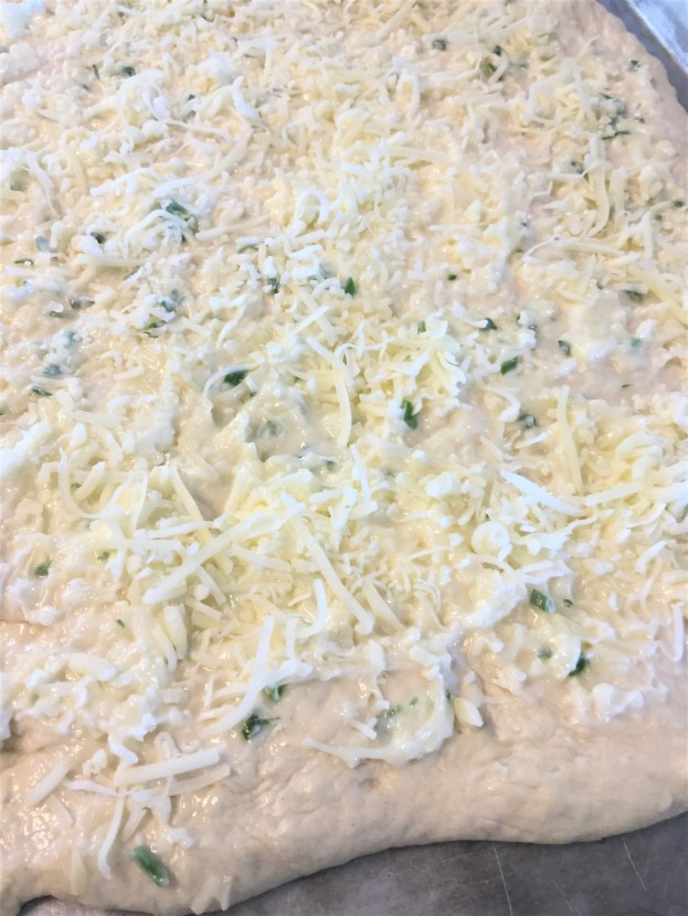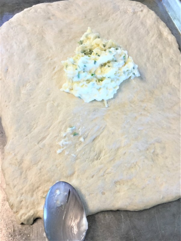 In a small bowl, mix together the butter, olive oil, garlic and chives/parsley. Spread it all over the dough.