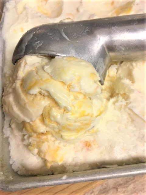 Whip the heavy cream into soft peaks. Add the vanilla and fold in the sweetened condensed milk. Gently stir in the peaches. Pour into a metal loaf pan. Cover with plastic wrap and freeze for at least 5 hours. IT’S SO HARD WAITING!!!!!!!!!!