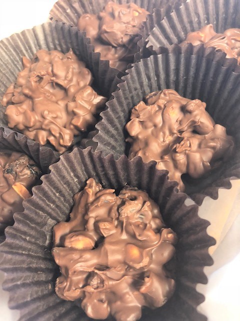 Pour the chocolate into a large bowl with your add ins. Stir it all up. Place some baking cups (cupcake liners) or wax paper onto a baking sheet. Plop about 2 Tblsp of the candy mixture into the baking cups or onto a piece of wax paper. Chill for few minutes to set up. Once set, place your beautiful little clusters into candy boxes, tins or eat em up all by yourself. You deserve it.
