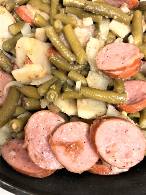 So, let’s get to cookin. This is one of those super quick, comfort food dishes. I mean, it’s only 4 ingredients!! It’s so simple, but so tasty. An old friend made this for me years ago and now I make it all the time. I usually use kielbasa sausage, but it’s also good with hot links. There is something about the combination of the sausage, potatoes and green beans that is just so good. The potatoes absorb the flavor of the sausage….yummmmmm. It may sound odd, but trust me. If you make it, you will make it again and again. I did try it once with cabbage instead of the beans. It was very good. But I feel like it needs the beans. You can surely use fresh green beans, but I just use a regular ol can of beans.