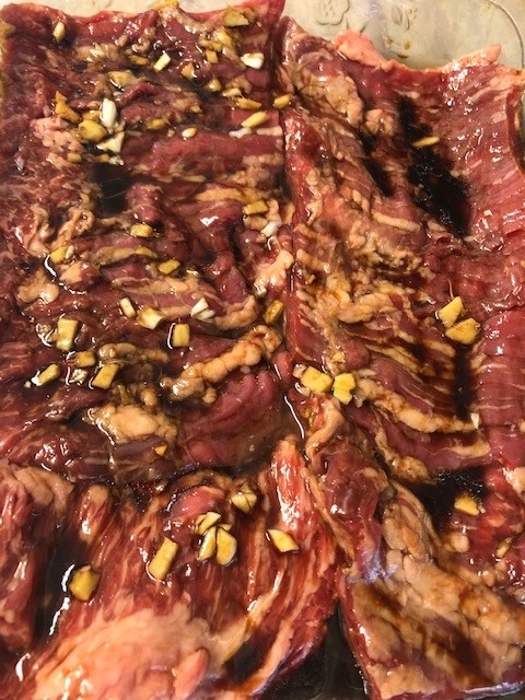 For this particular steak, I usually end up marinating for only 3 hours because I get impatient, but the longer the better. You can get some pent up aggression out too, because I take a fork and poke the hell out of this meat before I marinate it. The marinade is simple and delicious. Soy sauce is good on all kinds of meat!