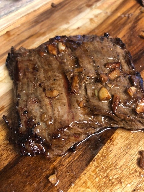 Pour the marinade over the steak and poke some more….both sides. Cover and refrigerate for at least 3 hours. When you’re ready to cook it, remove it from the fridge and allow it to come to room temperature.